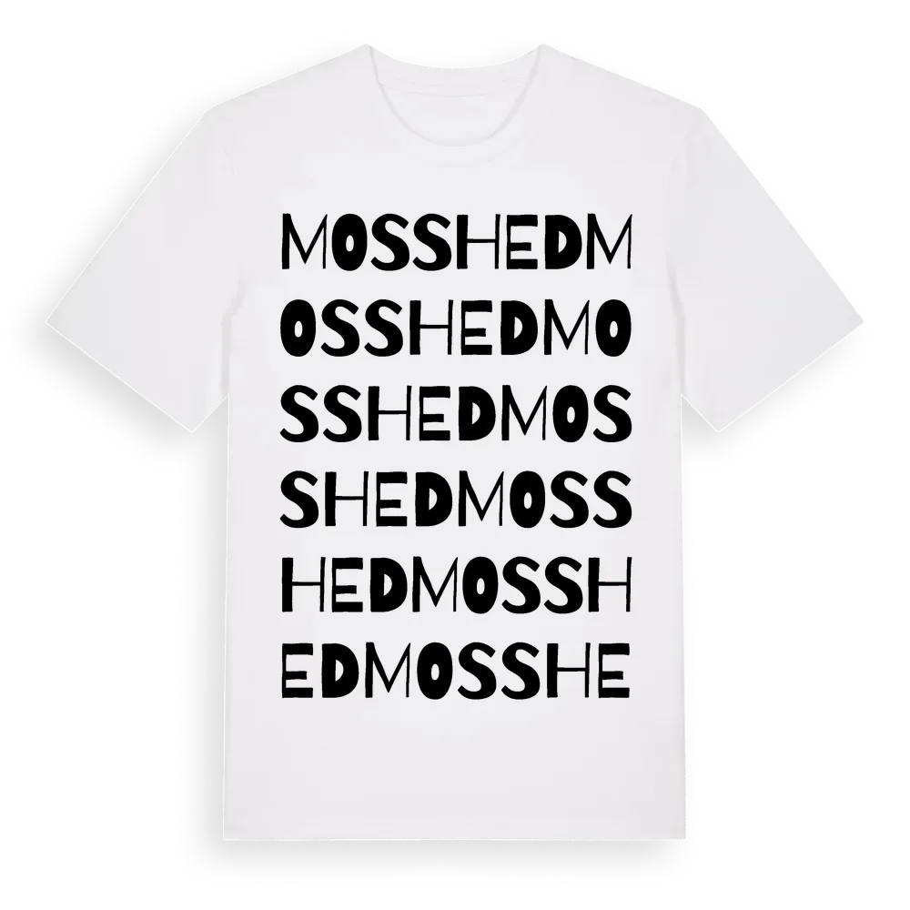 Mosshed ordlek t-shirt är inspirerad av byn Mosshed i Västra Götalands län, Sverige. Tröjan är designad för dig som har en speciell koppling till platsen – oavsett om du bor här, har rötterna här eller bara älskar Mosshed.