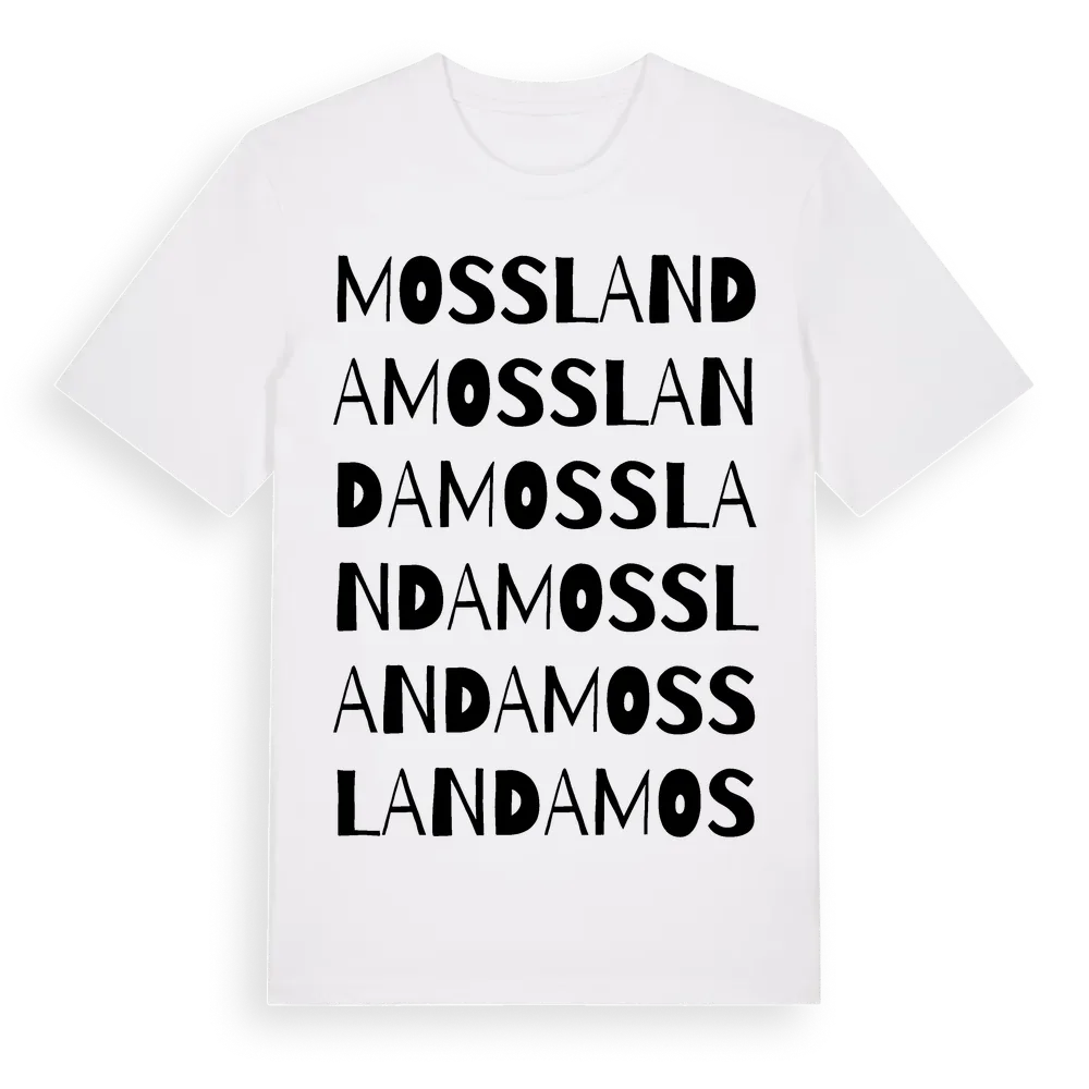 En ordlek byggd på Mosslandas namn. Subtilt och klurig – ett motiv som bara de som verkligen känner platsen fullt ut förstår. Premium bomull, unisex – från byn Mosslanda i Västra Götalands län.