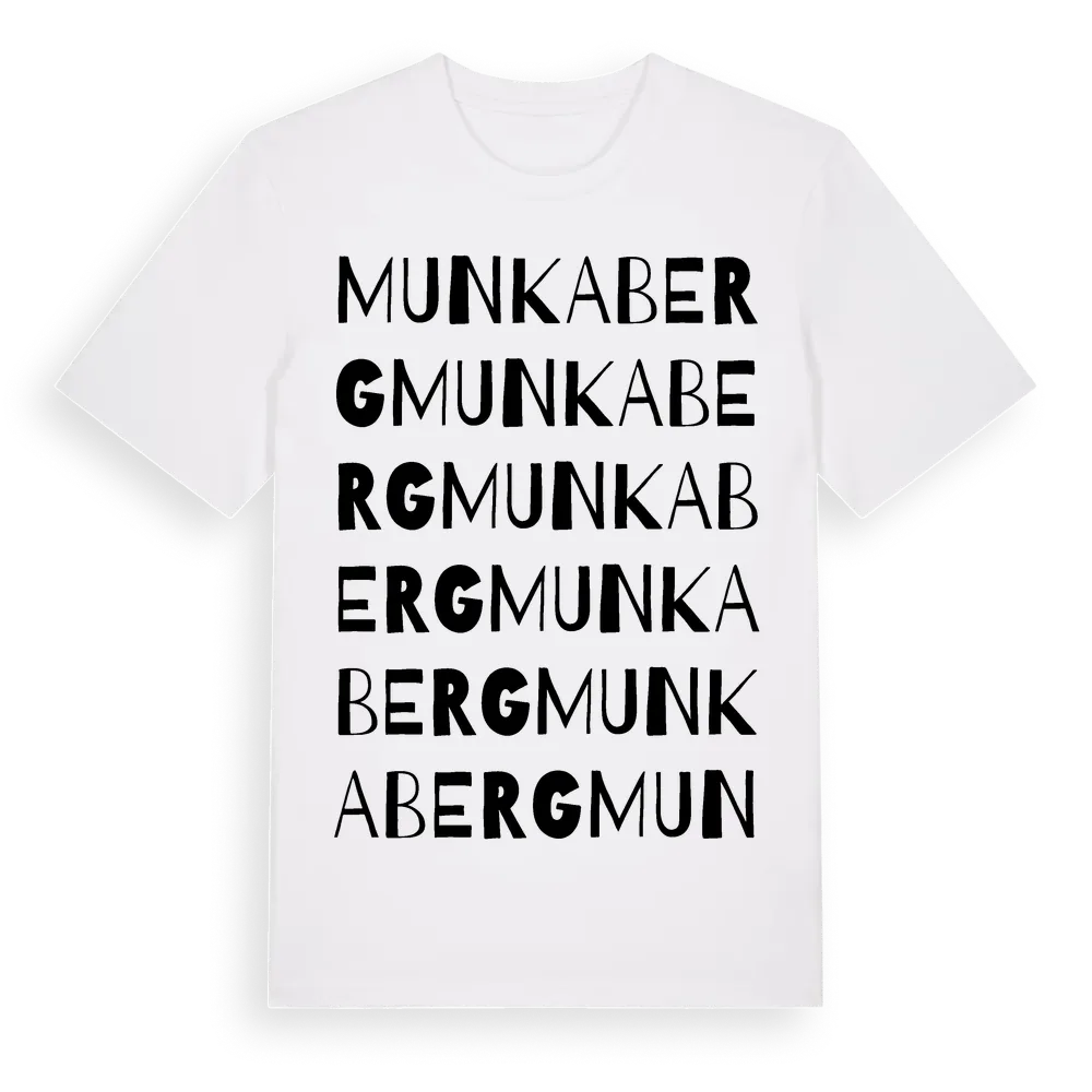 Munkaberg ordlek t-shirt är inspirerad av Munkaberg i Västra Götalands län, Sverige. Tröjan är designad för dig som har en speciell koppling till platsen – oavsett om du bor här, har rötterna här eller bara älskar Munkaberg.