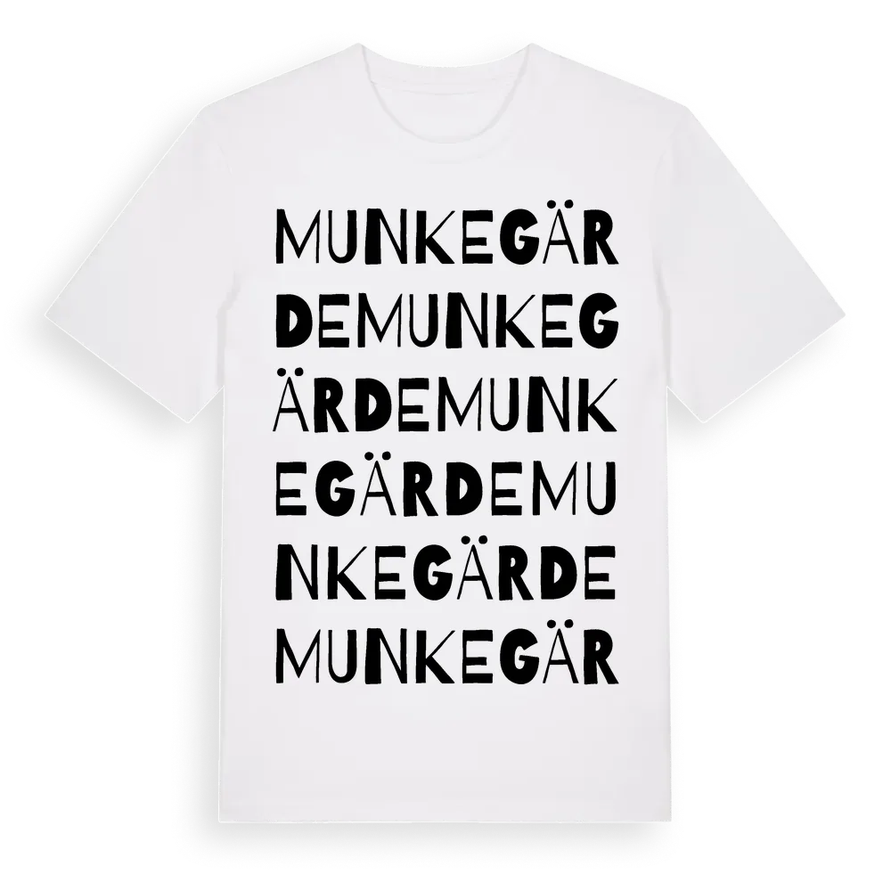 Munkegärde ordlek t-shirt är inspirerad av byn Munkegärde i Västra Götalands län, Sverige. Tröjan är designad för dig som har en speciell koppling till platsen – oavsett om du bor här, har rötterna här eller bara älskar Munkegärde.