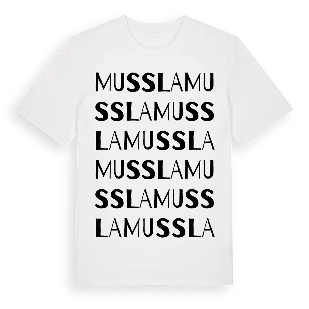 En ordlek byggd på Musslas namn. Subtilt och klurig – ett motiv som bara de som verkligen känner platsen fullt ut förstår. Premium bomull, unisex – från Mussla i Västra Götalands län.