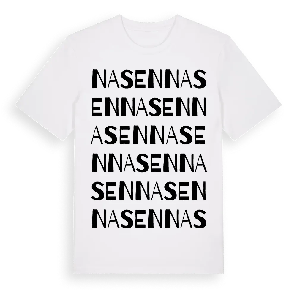 Nasen ordlek t-shirt är inspirerad av byn Nasen i Västra Götalands län, Sverige. Tröjan är designad för dig som har en speciell koppling till platsen – oavsett om du bor här, har rötterna här eller bara älskar Nasen.