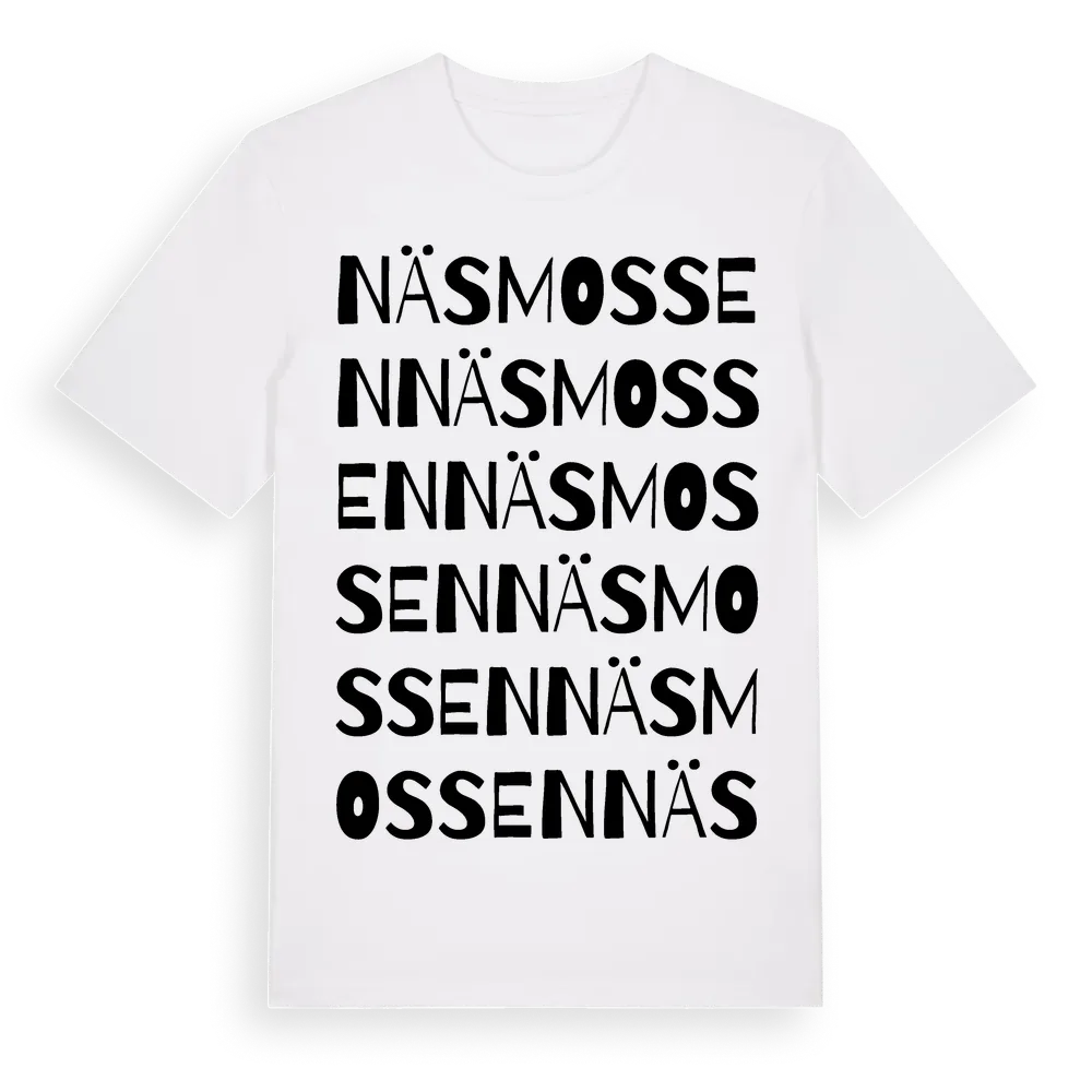 Näsmossen ordlek t-shirt är inspirerad av Näsmossen i Västra Götalands län, Sverige. Tröjan är designad för dig som har en speciell koppling till platsen – oavsett om du bor här, har rötterna här eller bara älskar Näsmossen.