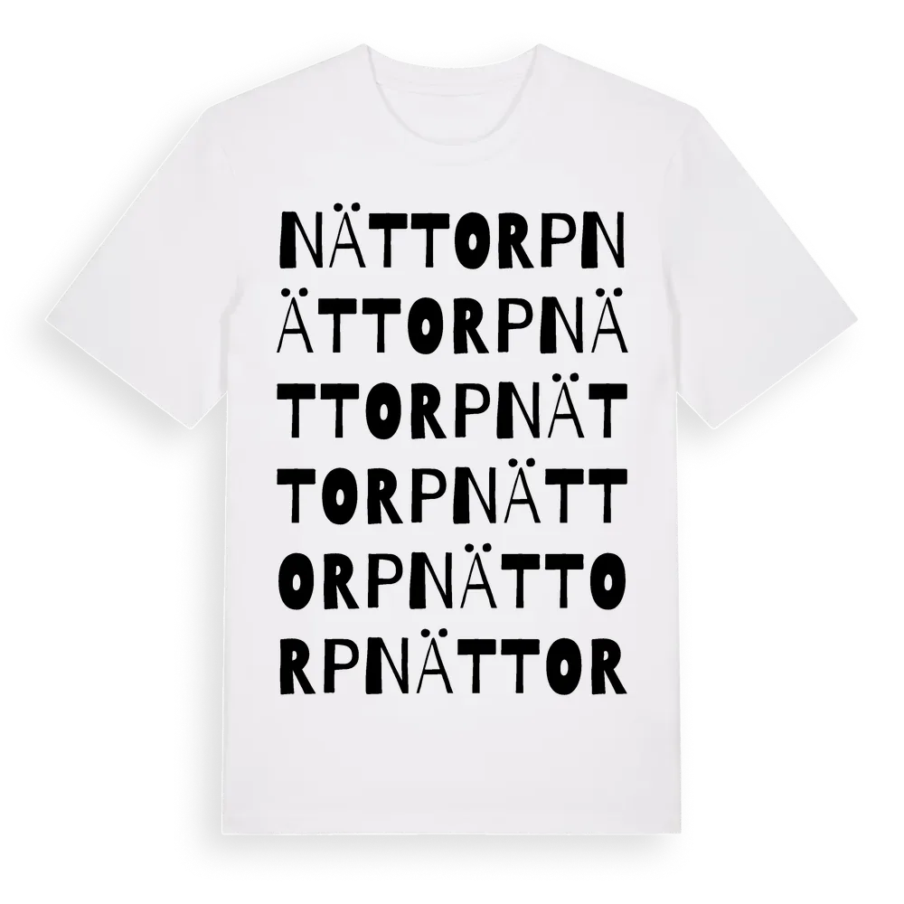 Nättorp ordlek t-shirt är inspirerad av Nättorp i Västra Götalands län, Sverige. Tröjan är designad för dig som har en speciell koppling till platsen – oavsett om du bor här, har rötterna här eller bara älskar Nättorp.