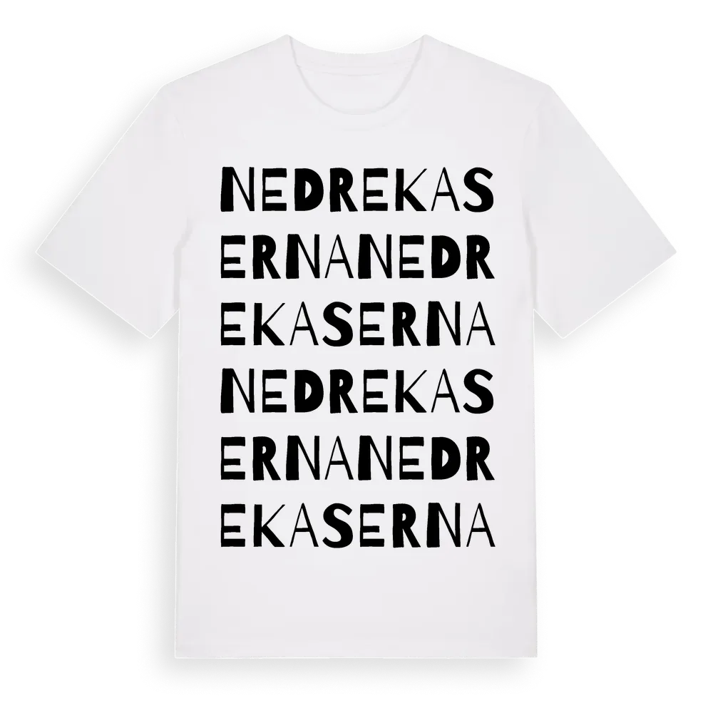 Nedre Kaserna ordlek t-shirt är inspirerad av Nedre Kaserna i Västra Götalands län, Sverige. Tröjan är designad för dig som har en speciell koppling till platsen – oavsett om du bor här, har rötterna här eller bara älskar Nedre Kaserna.