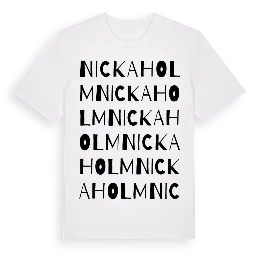 Nickaholm ordlek t-shirt är inspirerad av Nickaholm i Västra Götalands län, Sverige. Tröjan är designad för dig som har en speciell koppling till platsen – oavsett om du bor här, har rötterna här eller bara älskar Nickaholm.