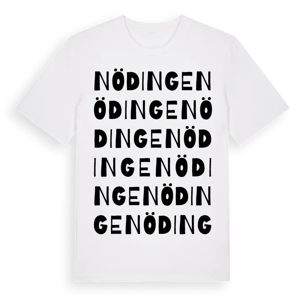 En ordlek byggd på Nödinges namn. Subtilt och klurig – ett motiv som bara de som verkligen känner platsen fullt ut förstår. Premium bomull, unisex – från byn Nödinge i Västra Götalands län.