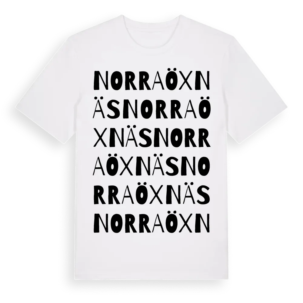 Norra Öxnäs ordlek t-shirt är inspirerad av Norra Öxnäs i Västra Götalands län, Sverige. Tröjan är designad för dig som har en speciell koppling till platsen – oavsett om du bor här, har rötterna här eller bara älskar Norra Öxnäs.