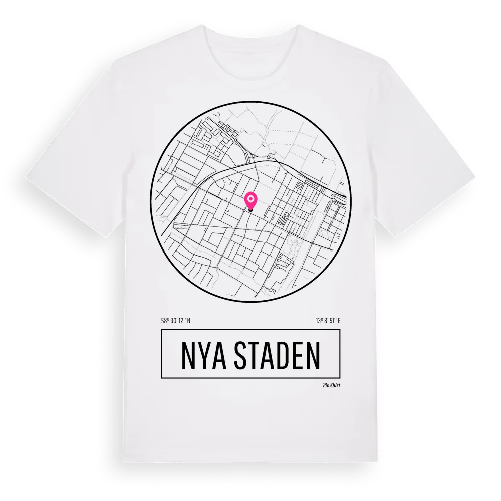 Nya Staden t-shirt är inspirerad av stadsdelen Nya Staden i Västra Götalands län, Sverige. Tröjan är designad för dig som har en speciell koppling till platsen – oavsett om du bor här, har rötterna här eller bara älskar Nya Staden.