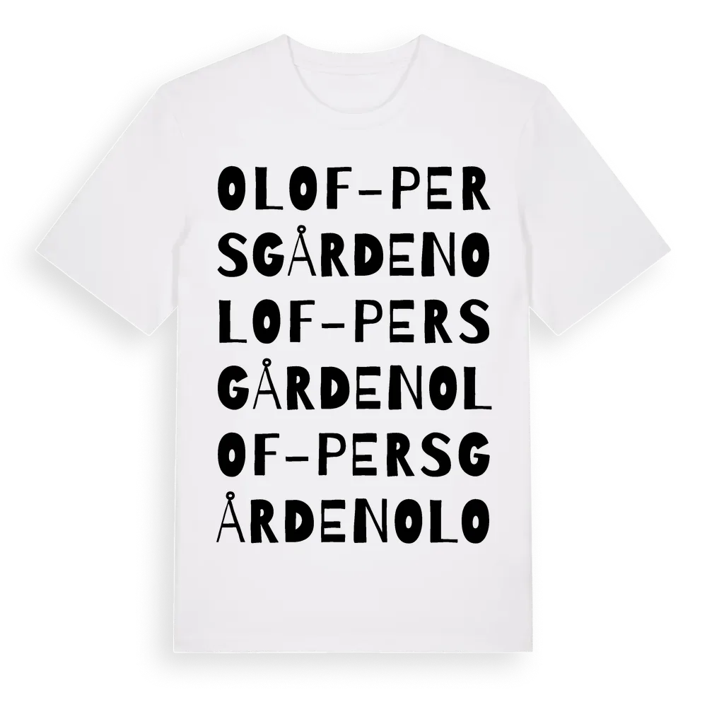 Olof-Persgården ordlek t-shirt är inspirerad av Olof-Persgården i Västra Götalands län, Sverige. Tröjan är designad för dig som har en speciell koppling till platsen – oavsett om du bor här, har rötterna här eller bara älskar Olof-Persgården.