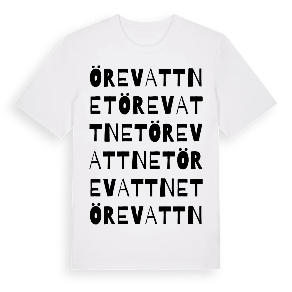 Örevattnet ordlek t-shirt är inspirerad av Örevattnet i Västra Götalands län, Sverige. Tröjan är designad för dig som har en speciell koppling till platsen – oavsett om du bor här, har rötterna här eller bara älskar Örevattnet.