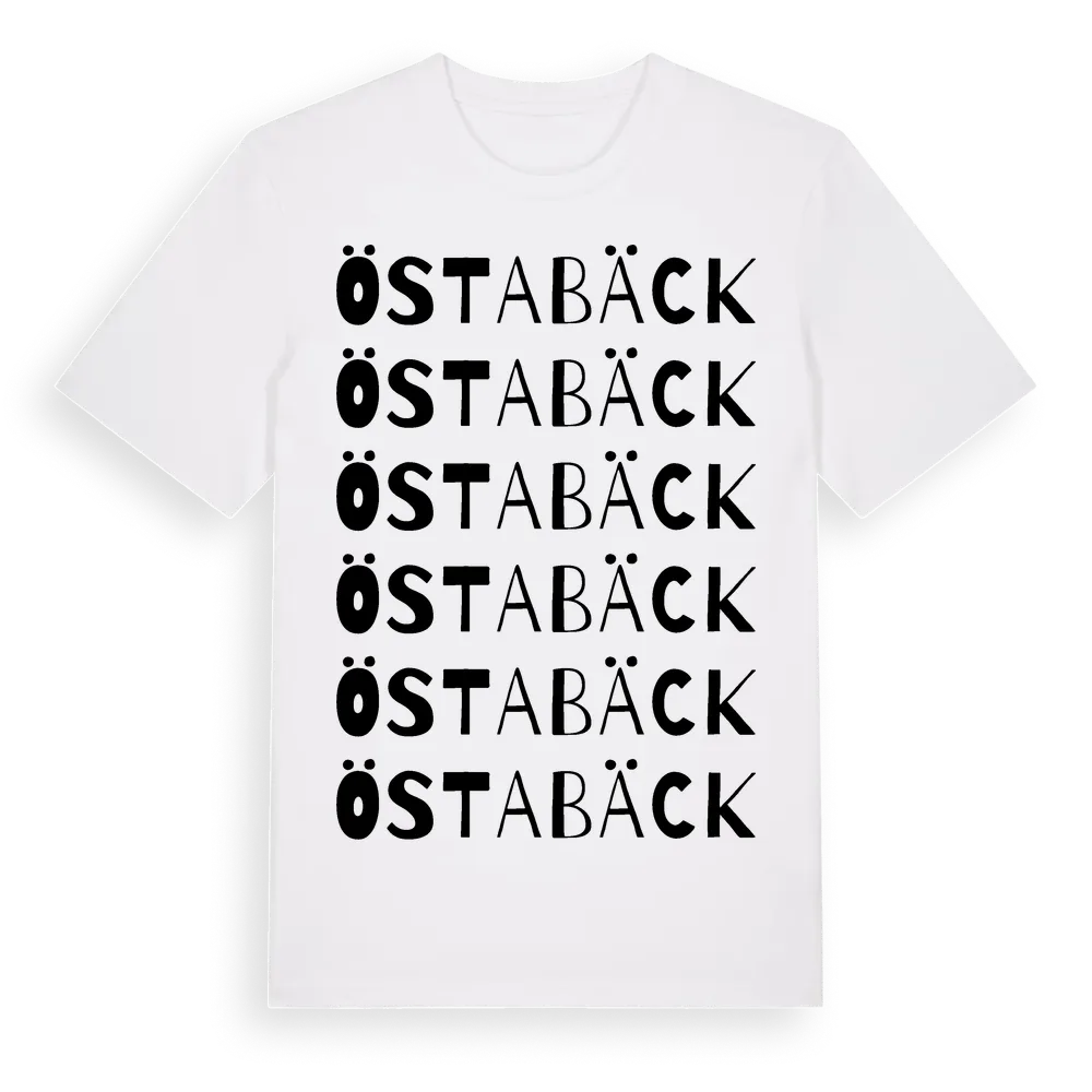 Östabäck ordlek t-shirt är inspirerad av byn Östabäck i Västra Götalands län, Sverige. Tröjan är designad för dig som har en speciell koppling till platsen – oavsett om du bor här, har rötterna här eller bara älskar Östabäck.