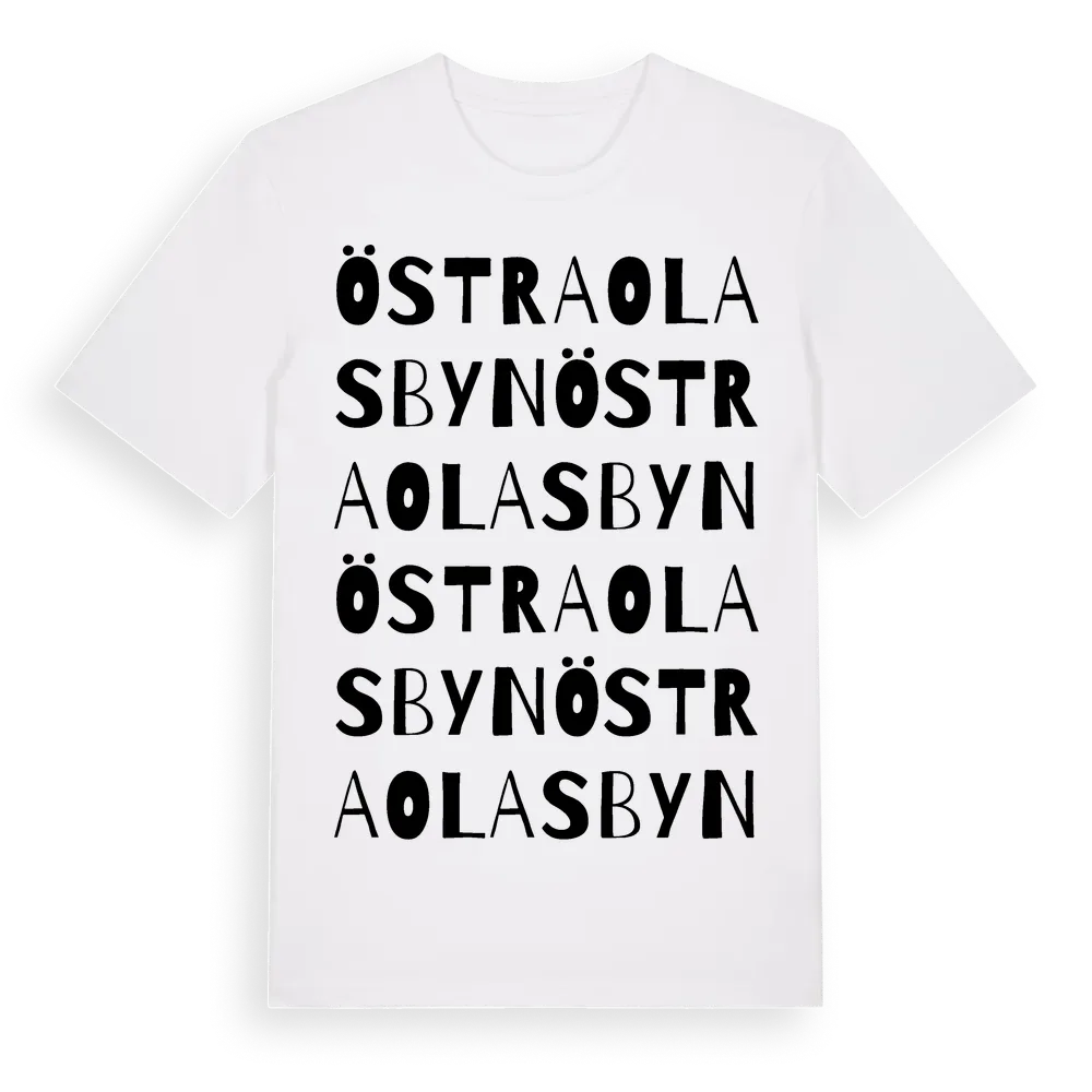 Östra Olasbyn ordlek t-shirt är inspirerad av byn Östra Olasbyn i Västra Götalands län, Sverige. Tröjan är designad för dig som har en speciell koppling till platsen – oavsett om du bor här, har rötterna här eller bara älskar Östra Olasbyn.