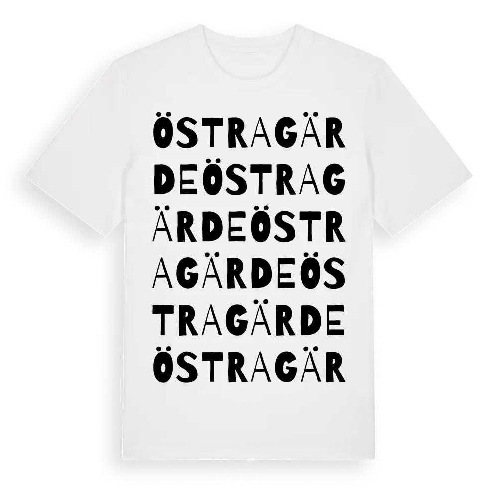 Östragärde ordlek t-shirt är inspirerad av Östragärde i Västra Götalands län, Sverige. Tröjan är designad för dig som har en speciell koppling till platsen – oavsett om du bor här, har rötterna här eller bara älskar Östragärde.