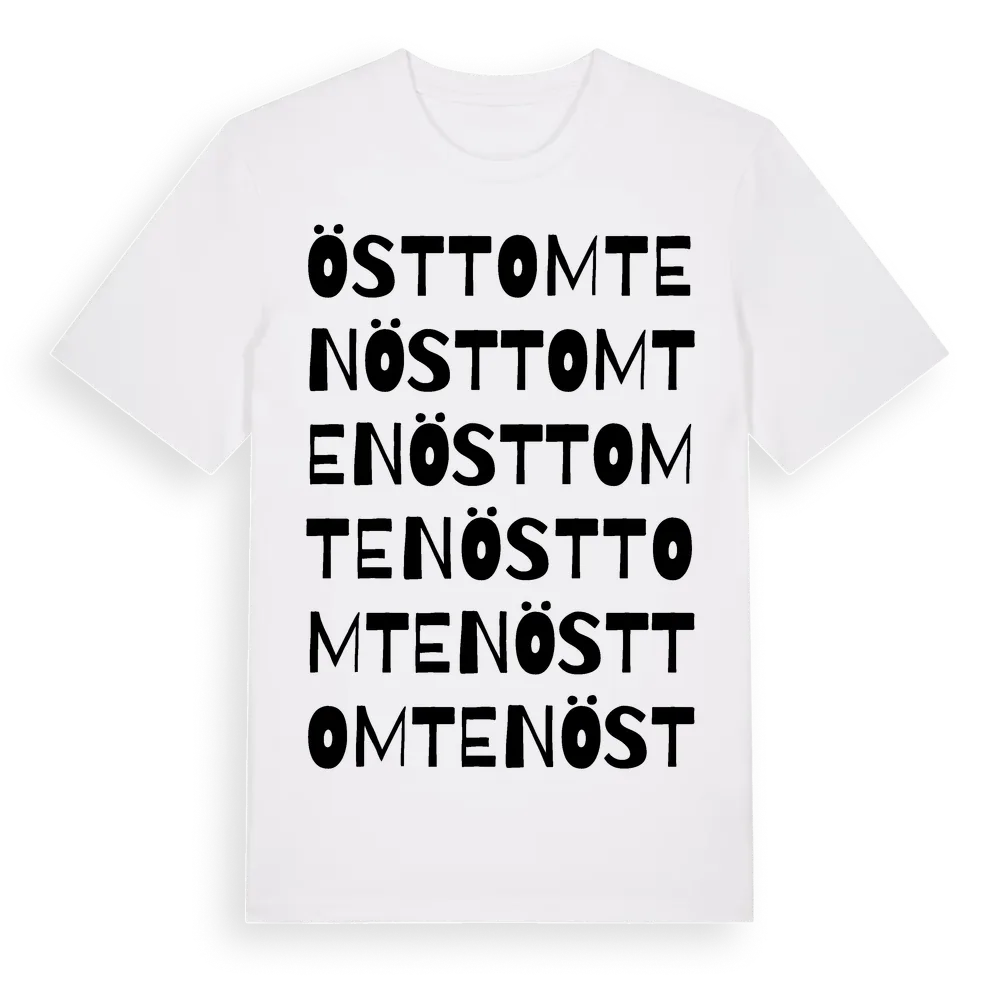 Östtomten ordlek t-shirt är inspirerad av Östtomten i Västra Götalands län, Sverige. Tröjan är designad för dig som har en speciell koppling till platsen – oavsett om du bor här, har rötterna här eller bara älskar Östtomten.