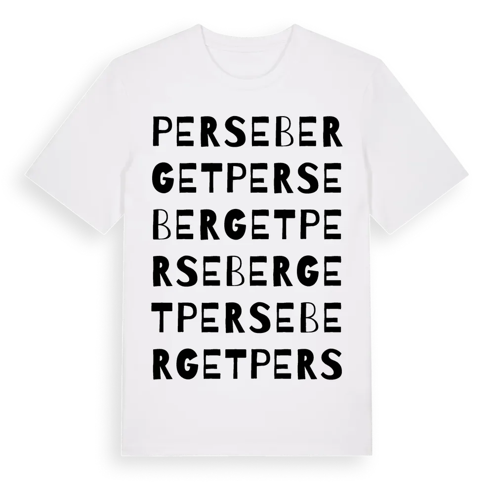 En ordlek byggd på Persebergets namn. Subtilt och klurig – ett motiv som bara de som verkligen känner platsen fullt ut förstår. Premium bomull, unisex – från Perseberget i Västra Götalands län.