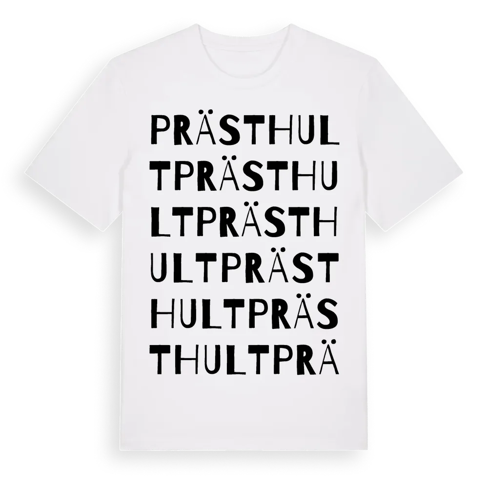 Prästhult ordlek t-shirt är inspirerad av byn Prästhult i Västra Götalands län, Sverige. Tröjan är designad för dig som har en speciell koppling till platsen – oavsett om du bor här, har rötterna här eller bara älskar Prästhult.