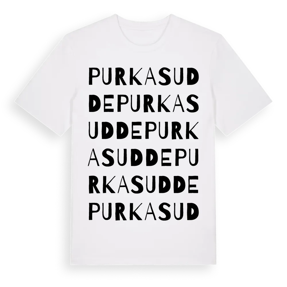 Purkas Udde ordlek t-shirt är inspirerad av Purkas Udde i Västra Götalands län, Sverige. Tröjan är designad för dig som har en speciell koppling till platsen – oavsett om du bor här, har rötterna här eller bara älskar Purkas Udde.