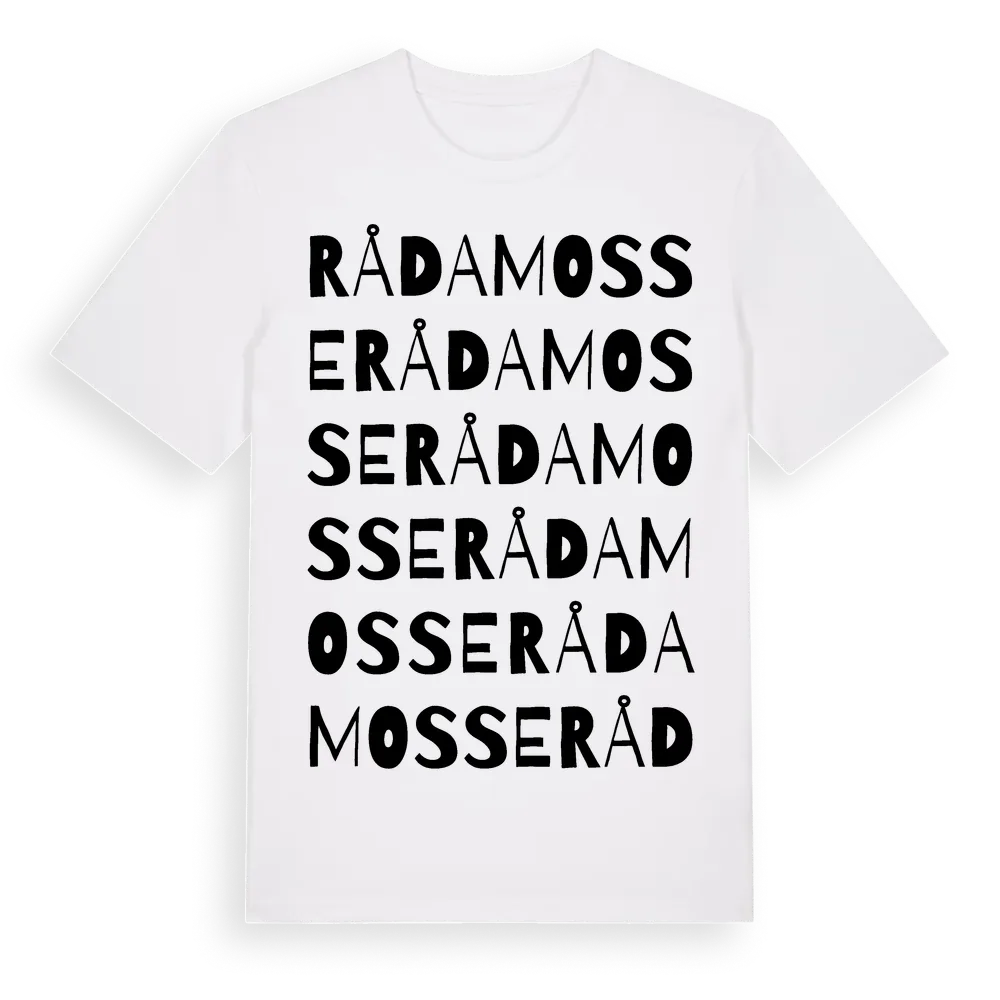 Råda Mosse ordlek t-shirt är inspirerad av stadsdelen Råda Mosse i Västra Götalands län, Sverige. Tröjan är designad för dig som har en speciell koppling till platsen – oavsett om du bor här, har rötterna här eller bara älskar Råda Mosse.