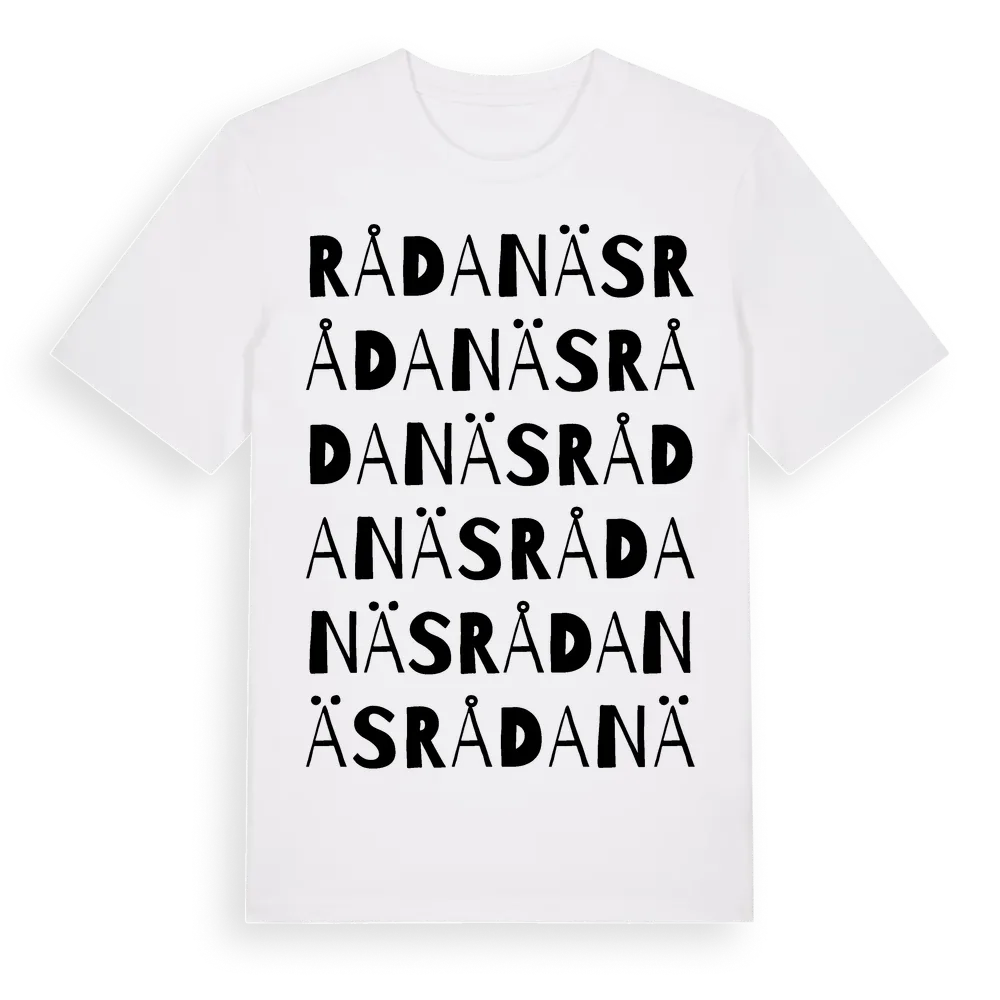 En ordlek byggd på Rådanäss namn. Subtilt och klurig – ett motiv som bara de som verkligen känner platsen fullt ut förstår. Premium bomull, unisex – från Rådanäs i Västra Götalands län.