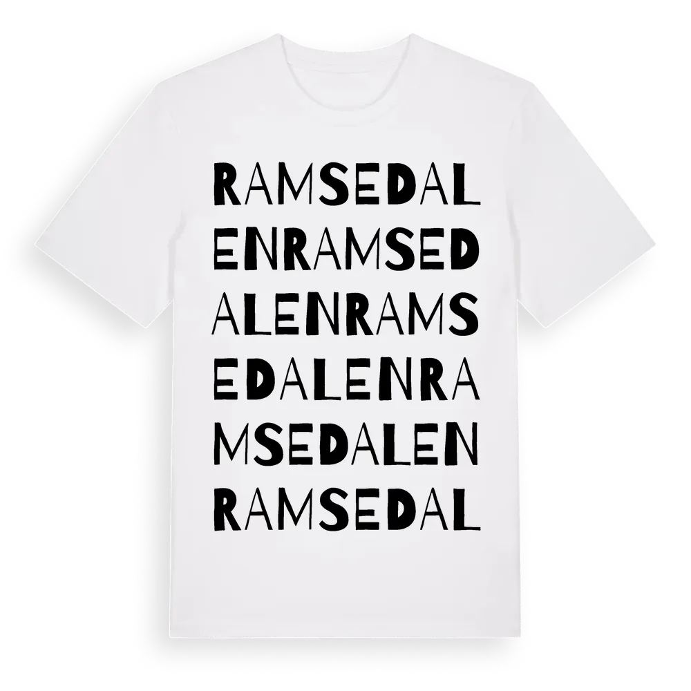 Ramsedalen ordlek t-shirt är inspirerad av Ramsedalen i Västra Götalands län, Sverige. Tröjan är designad för dig som har en speciell koppling till platsen – oavsett om du bor här, har rötterna här eller bara älskar Ramsedalen.