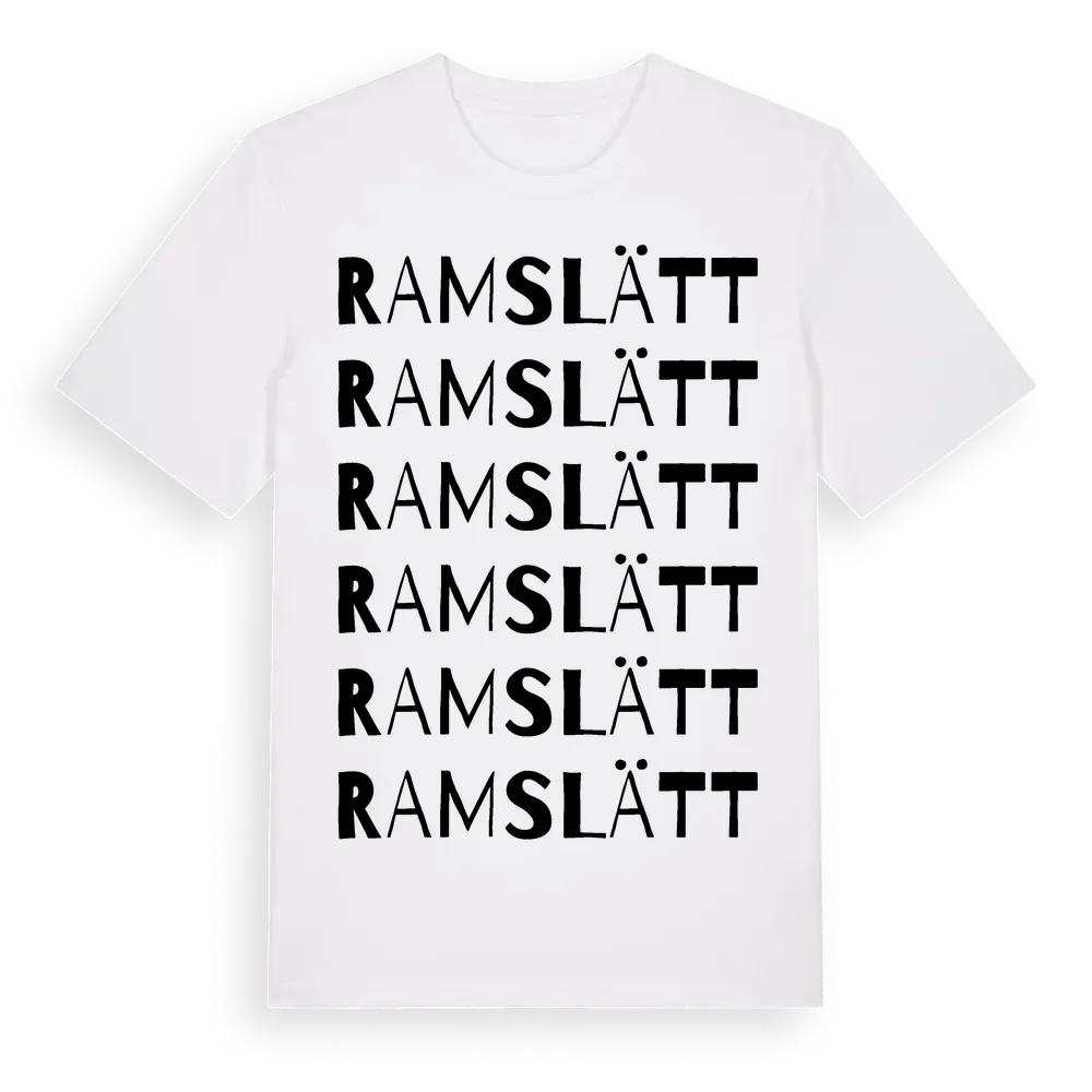 Ramslätt ordlek t-shirt är inspirerad av Ramslätt i Västra Götalands län, Sverige. Tröjan är designad för dig som har en speciell koppling till platsen – oavsett om du bor här, har rötterna här eller bara älskar Ramslätt.