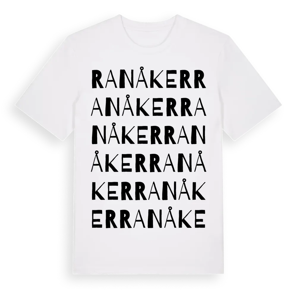 Ranåker ordlek t-shirt är inspirerad av byn Ranåker i Västra Götalands län, Sverige. Tröjan är designad för dig som har en speciell koppling till platsen – oavsett om du bor här, har rötterna här eller bara älskar Ranåker.