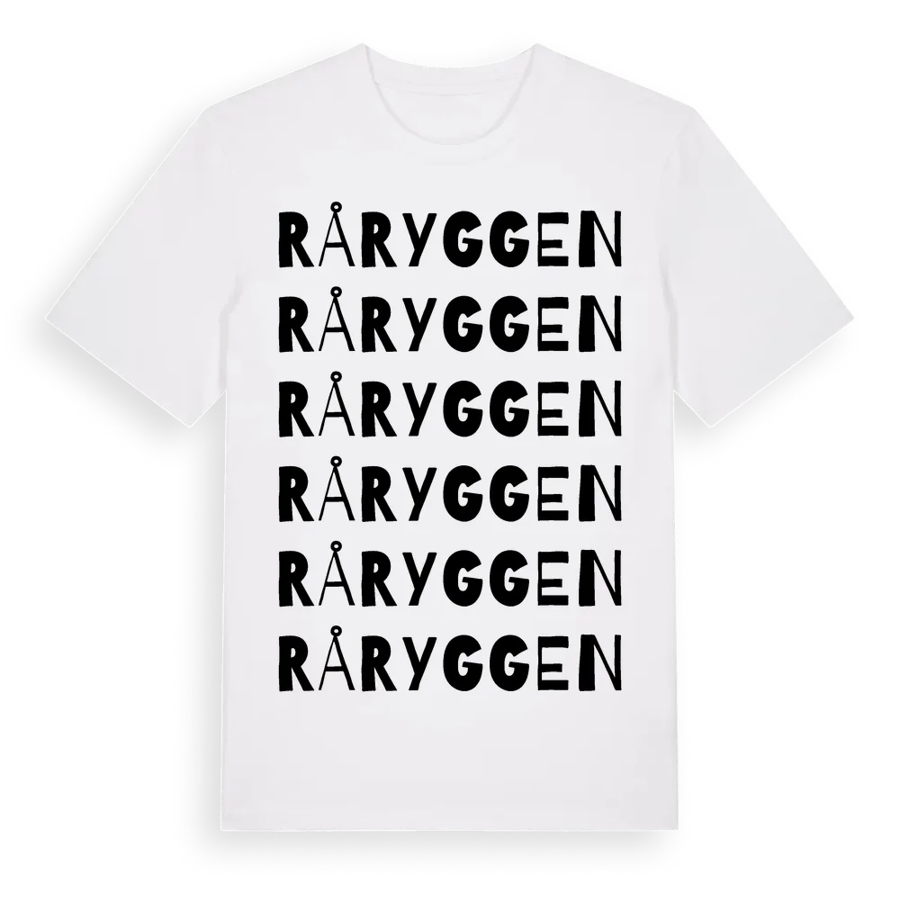 Råryggen ordlek t-shirt är inspirerad av byn Råryggen i Västra Götalands län, Sverige. Tröjan är designad för dig som har en speciell koppling till platsen – oavsett om du bor här, har rötterna här eller bara älskar Råryggen.