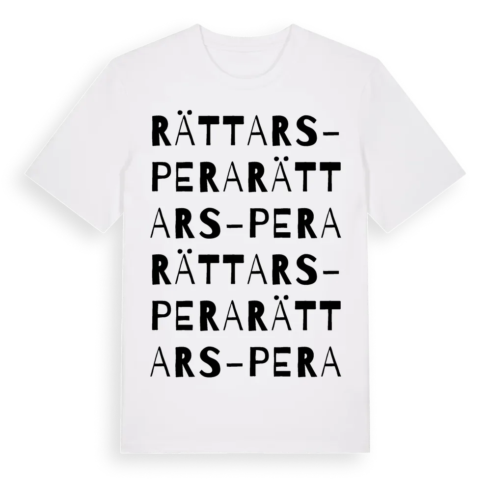 Rättars-Pera ordlek t-shirt är inspirerad av Rättars-Pera i Västra Götalands län, Sverige. Tröjan är designad för dig som har en speciell koppling till platsen – oavsett om du bor här, har rötterna här eller bara älskar Rättars-Pera.