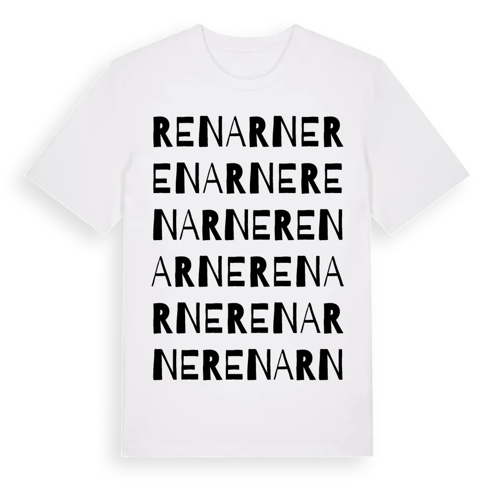 En ordlek byggd på Renarnes namn. Subtilt och klurig – ett motiv som bara de som verkligen känner platsen fullt ut förstår. Premium bomull, unisex – från Renarne i Västra Götalands län.