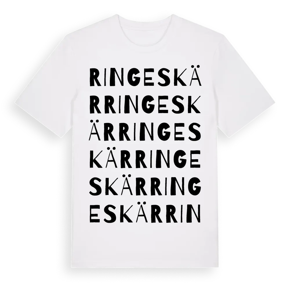 Ringeskär ordlek t-shirt är inspirerad av Ringeskär i Västra Götalands län, Sverige. Tröjan är designad för dig som har en speciell koppling till platsen – oavsett om du bor här, har rötterna här eller bara älskar Ringeskär.