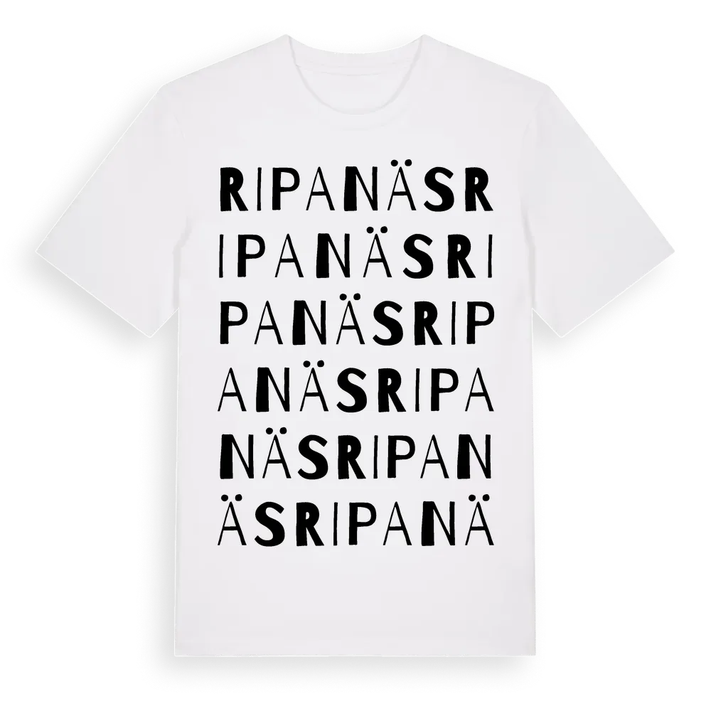 En ordlek byggd på Ripanäss namn. Subtilt och klurig – ett motiv som bara de som verkligen känner platsen fullt ut förstår. Premium bomull, unisex – från byn Ripanäs i Västra Götalands län.
