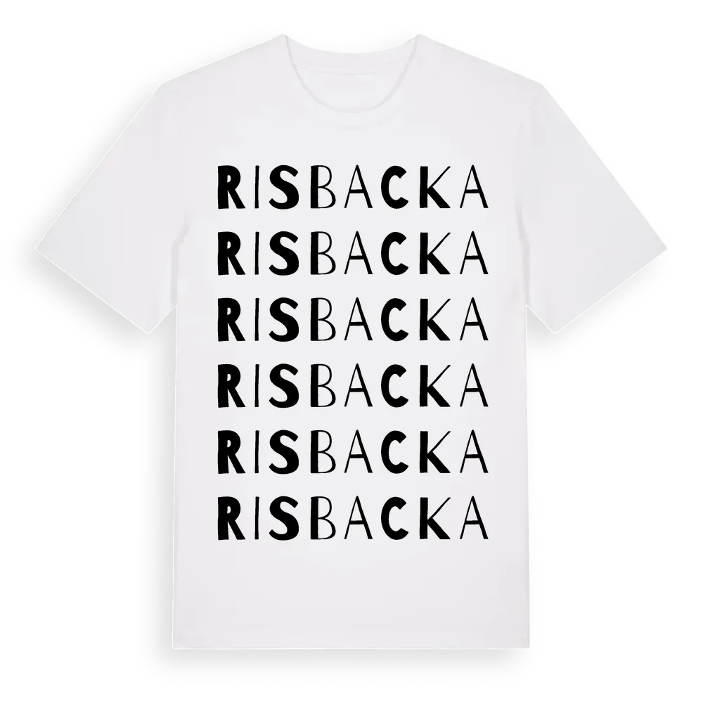 En ordlek byggd på Risbackas namn. Subtilt och klurig – ett motiv som bara de som verkligen känner platsen fullt ut förstår. Premium bomull, unisex – från byn Risbacka i Västra Götalands län.