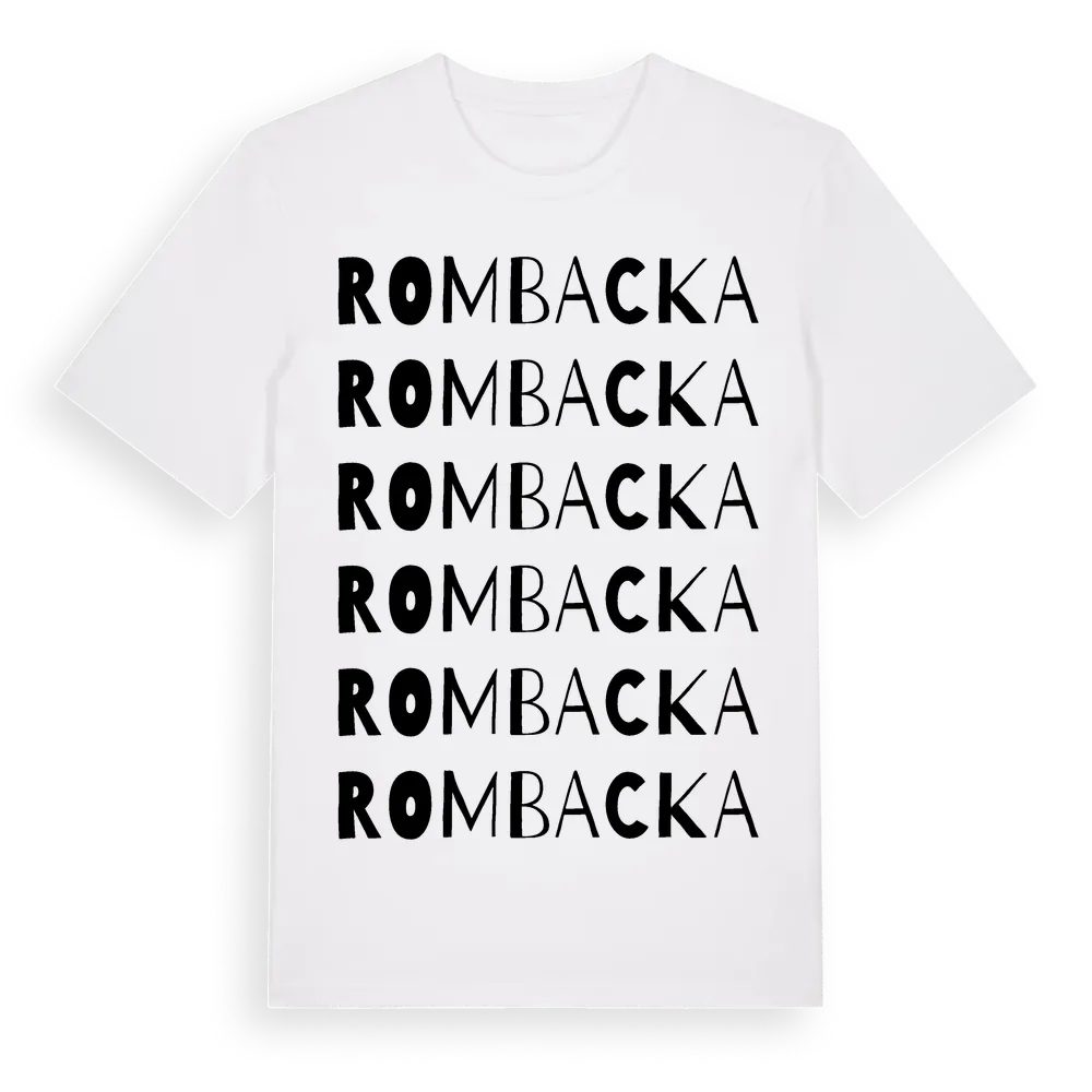 Rombacka ordlek t-shirt är inspirerad av byn Rombacka i Västra Götalands län, Sverige. Tröjan är designad för dig som har en speciell koppling till platsen – oavsett om du bor här, har rötterna här eller bara älskar Rombacka.