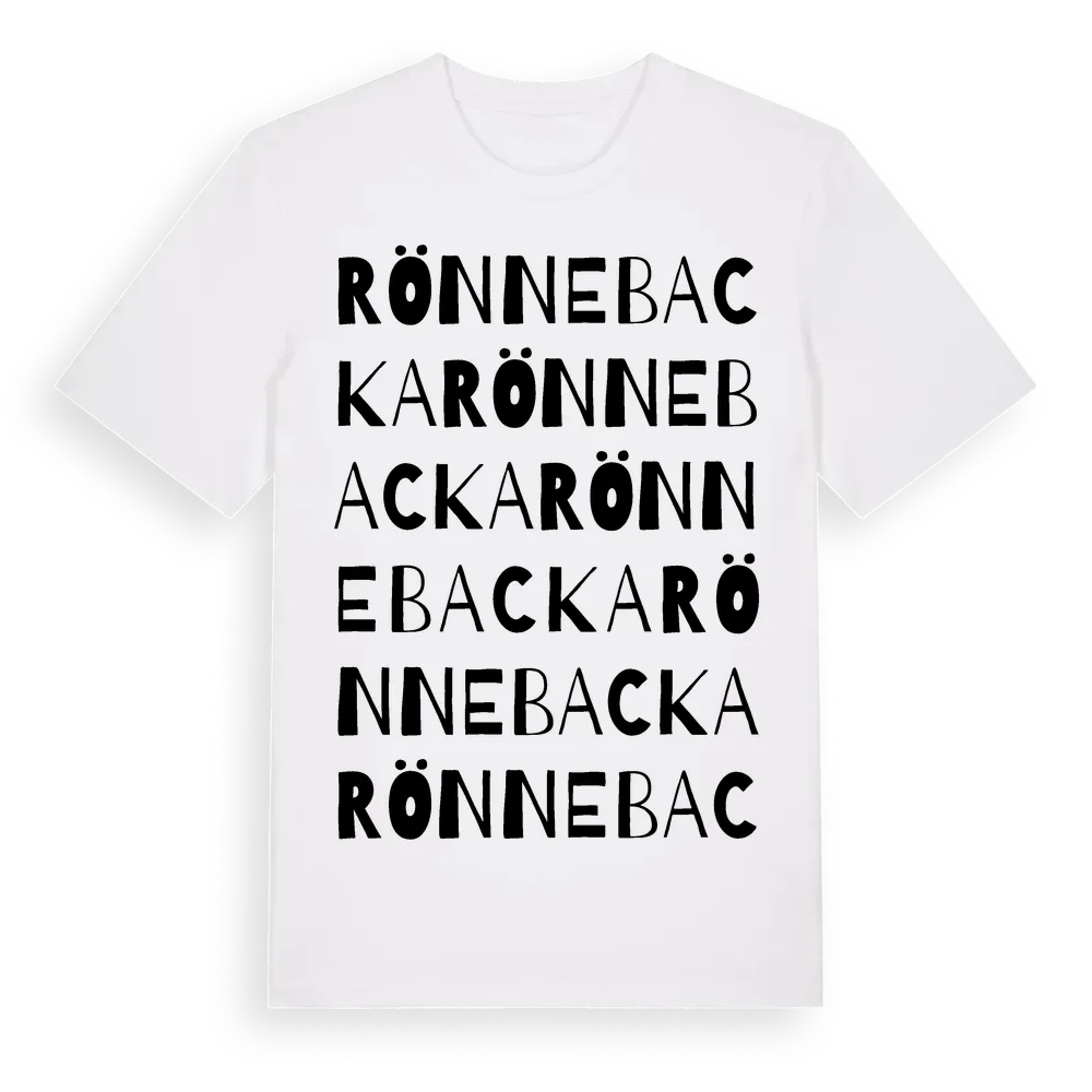 Rönnebacka ordlek t-shirt är inspirerad av Rönnebacka i Västra Götalands län, Sverige. Tröjan är designad för dig som har en speciell koppling till platsen – oavsett om du bor här, har rötterna här eller bara älskar Rönnebacka.