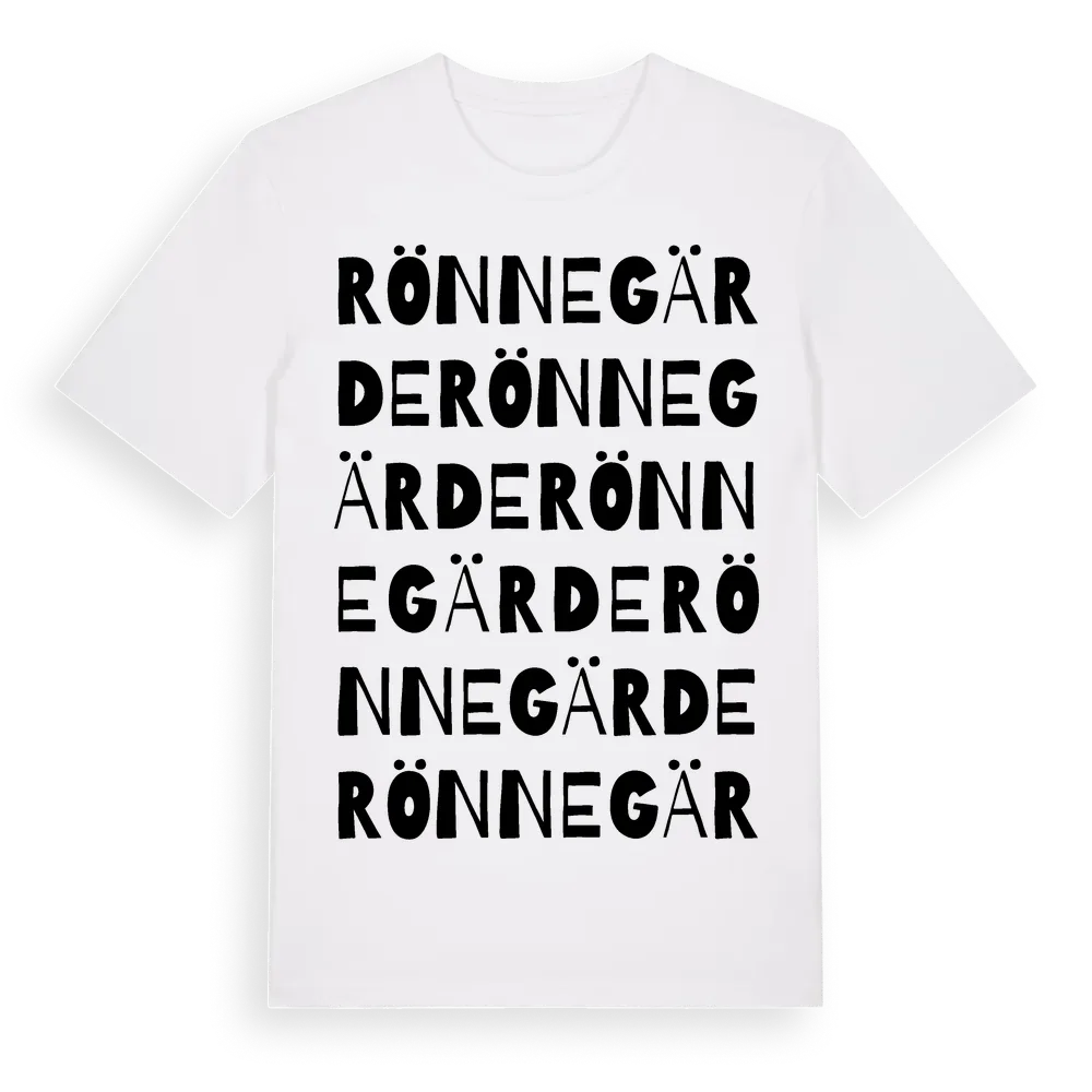 Rönnegärde ordlek t-shirt är inspirerad av Rönnegärde i Västra Götalands län, Sverige. Tröjan är designad för dig som har en speciell koppling till platsen – oavsett om du bor här, har rötterna här eller bara älskar Rönnegärde.