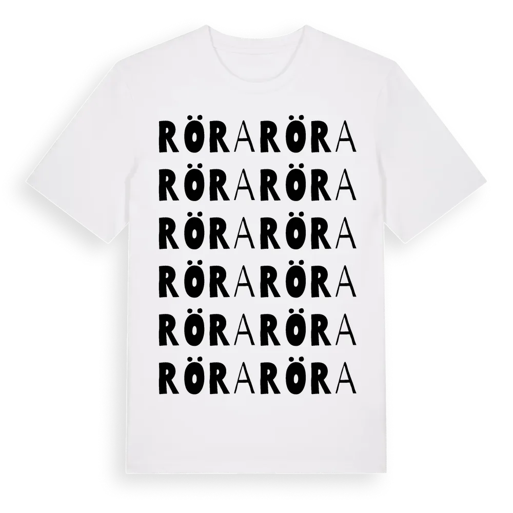 En ordlek byggd på Röras namn. Subtilt och klurig – ett motiv som bara de som verkligen känner platsen fullt ut förstår. Premium bomull, unisex – från byn Röra i Västra Götalands län.