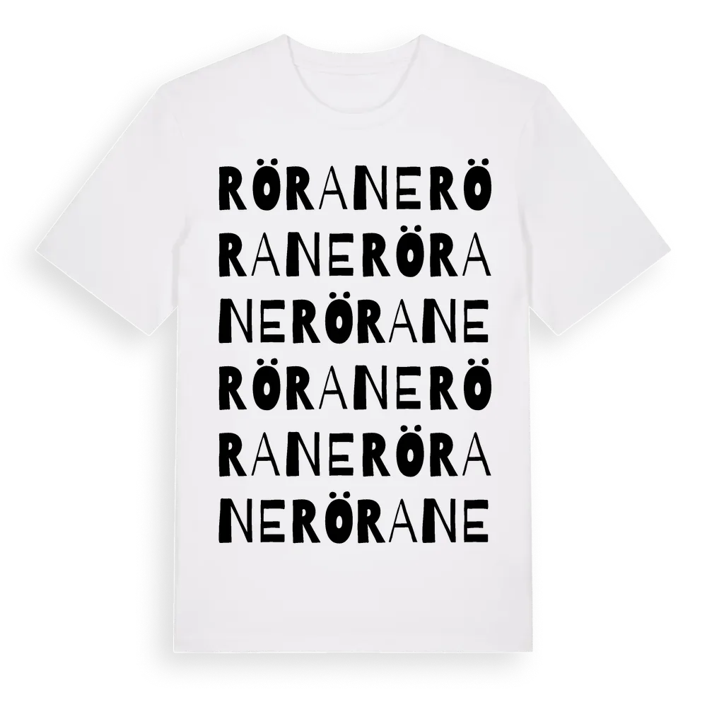 Rörane ordlek t-shirt är inspirerad av byn Rörane i Västra Götalands län, Sverige. Tröjan är designad för dig som har en speciell koppling till platsen – oavsett om du bor här, har rötterna här eller bara älskar Rörane.