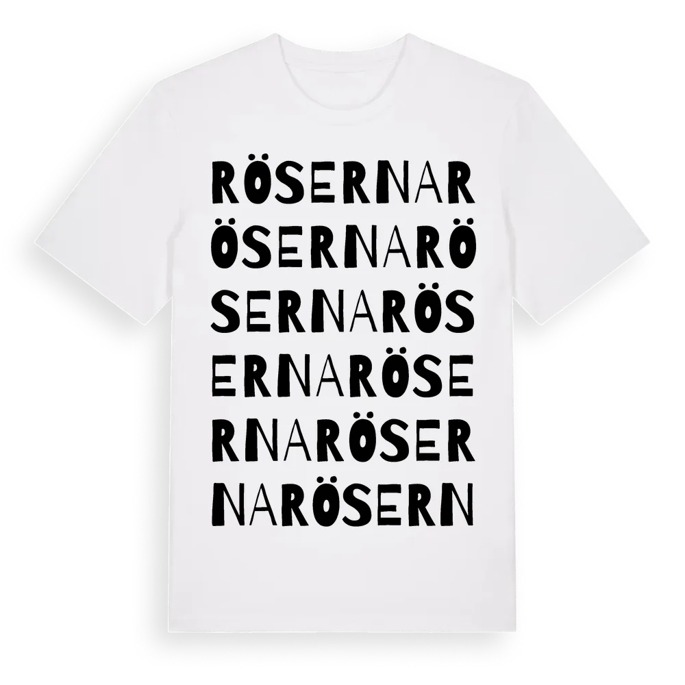 Röserna ordlek t-shirt är inspirerad av Röserna i Västra Götalands län, Sverige. Tröjan är designad för dig som har en speciell koppling till platsen – oavsett om du bor här, har rötterna här eller bara älskar Röserna.
