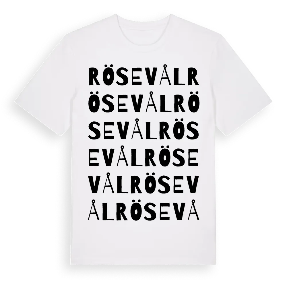 Rösevål ordlek t-shirt är inspirerad av byn Rösevål i Västra Götalands län, Sverige. Tröjan är designad för dig som har en speciell koppling till platsen – oavsett om du bor här, har rötterna här eller bara älskar Rösevål.