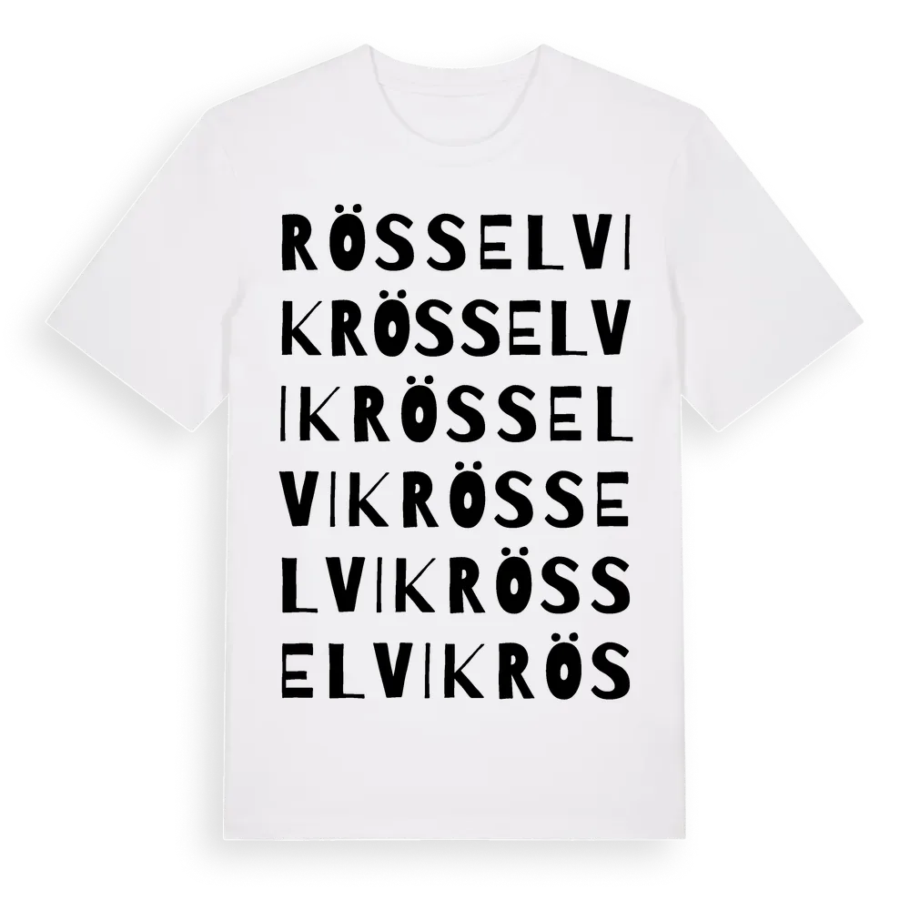 Rösselvik ordlek t-shirt är inspirerad av Rösselvik i Västra Götalands län, Sverige. Tröjan är designad för dig som har en speciell koppling till platsen – oavsett om du bor här, har rötterna här eller bara älskar Rösselvik.