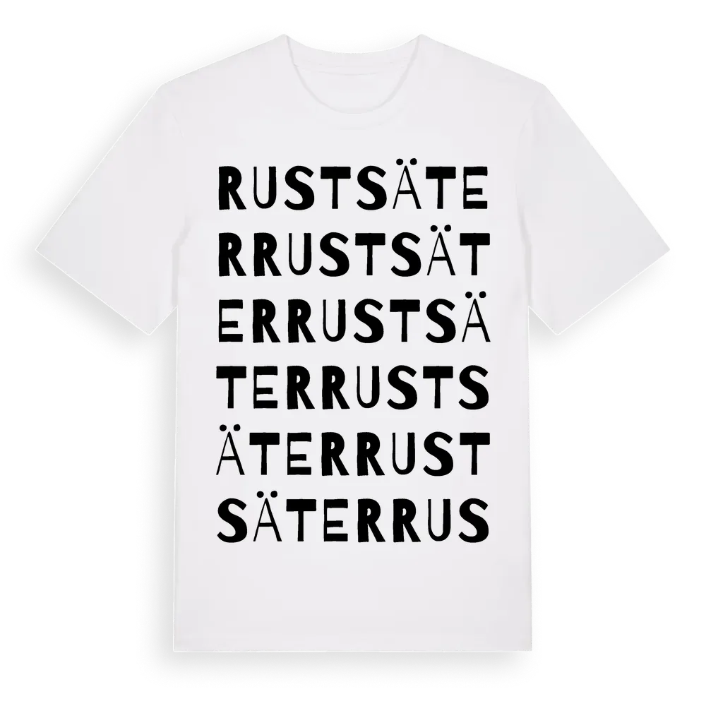 Rustsäter ordlek t-shirt är inspirerad av byn Rustsäter i Västra Götalands län, Sverige. Tröjan är designad för dig som har en speciell koppling till platsen – oavsett om du bor här, har rötterna här eller bara älskar Rustsäter.