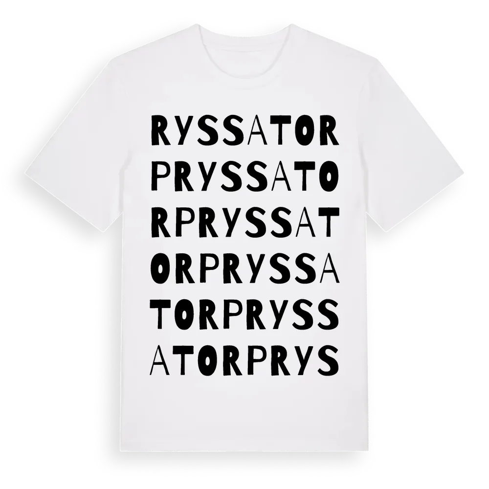 Ryssatorp ordlek t-shirt är inspirerad av byn Ryssatorp i Västra Götalands län, Sverige. Tröjan är designad för dig som har en speciell koppling till platsen – oavsett om du bor här, har rötterna här eller bara älskar Ryssatorp.