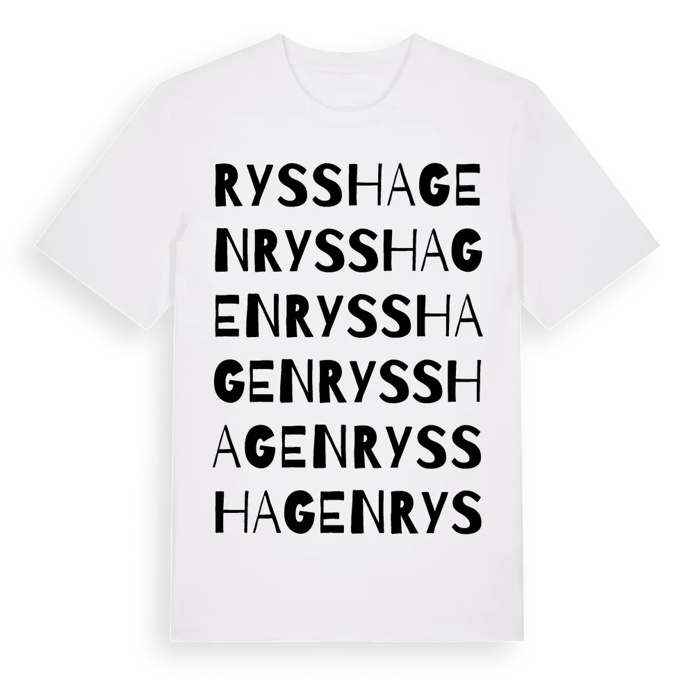 Rysshagen ordlek t-shirt är inspirerad av byn Rysshagen i Västra Götalands län, Sverige. Tröjan är designad för dig som har en speciell koppling till platsen – oavsett om du bor här, har rötterna här eller bara älskar Rysshagen.