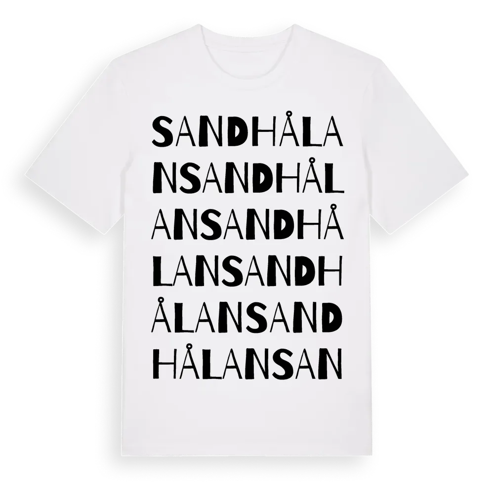 Sandhålan ordlek t-shirt är inspirerad av Sandhålan i Västra Götalands län, Sverige. Tröjan är designad för dig som har en speciell koppling till platsen – oavsett om du bor här, har rötterna här eller bara älskar Sandhålan.