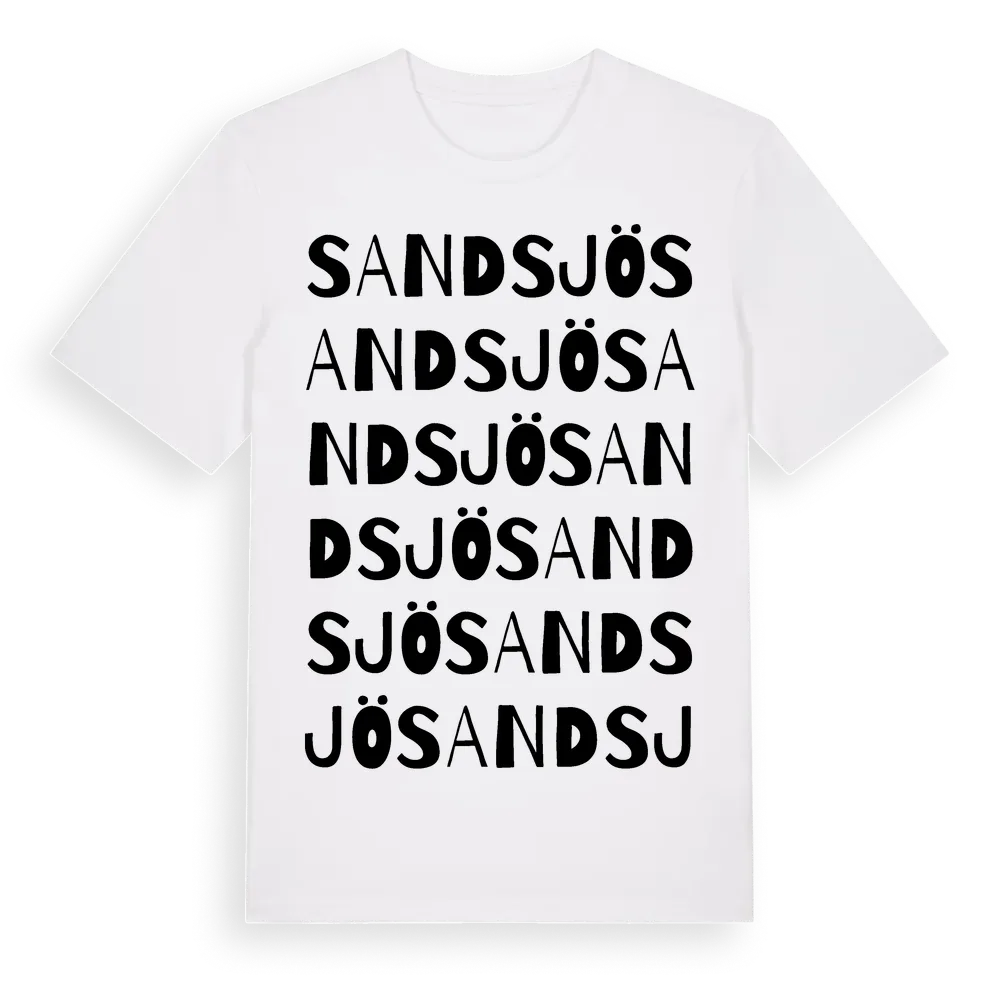 Sandsjö ordlek t-shirt är inspirerad av Sandsjö i Västra Götalands län, Sverige. Tröjan är designad för dig som har en speciell koppling till platsen – oavsett om du bor här, har rötterna här eller bara älskar Sandsjö.