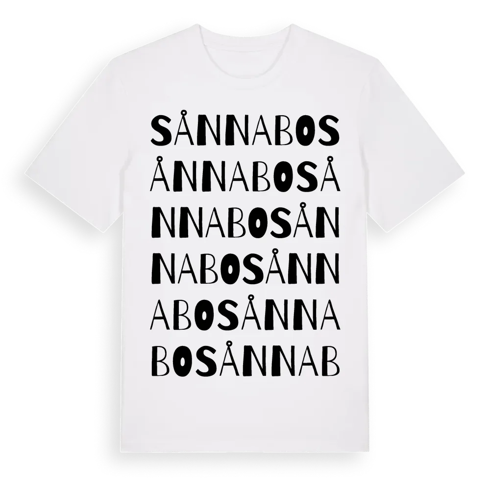 Sånnabo ordlek t-shirt är inspirerad av byn Sånnabo i Västra Götalands län, Sverige. Tröjan är designad för dig som har en speciell koppling till platsen – oavsett om du bor här, har rötterna här eller bara älskar Sånnabo.