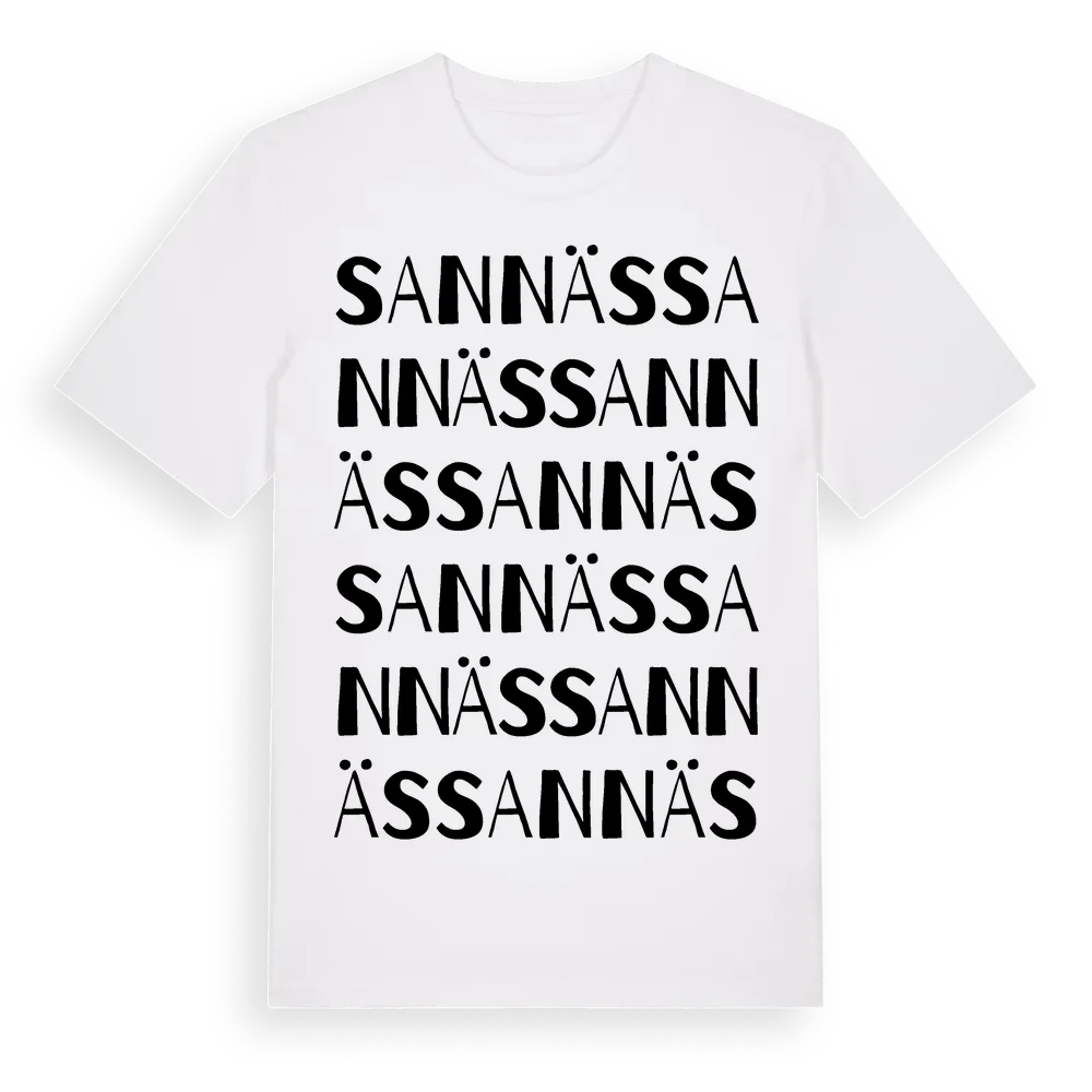 Sannäs ordlek t-shirt är inspirerad av byn Sannäs i Västra Götalands län, Sverige. Tröjan är designad för dig som har en speciell koppling till platsen – oavsett om du bor här, har rötterna här eller bara älskar Sannäs.