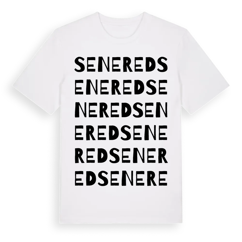 Senered ordlek t-shirt är inspirerad av Senered i Västra Götalands län, Sverige. Tröjan är designad för dig som har en speciell koppling till platsen – oavsett om du bor här, har rötterna här eller bara älskar Senered.