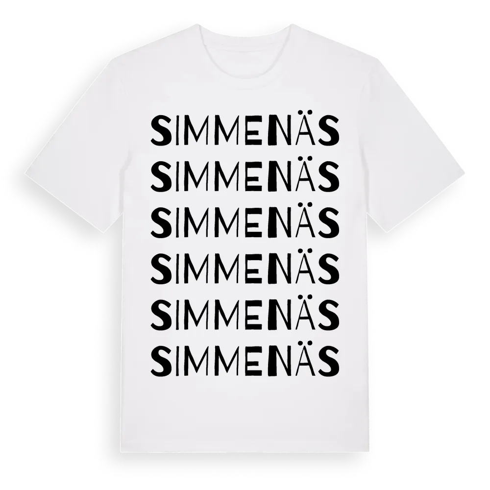 Simmenäs ordlek t-shirt är inspirerad av byn Simmenäs i Västra Götalands län, Sverige. Tröjan är designad för dig som har en speciell koppling till platsen – oavsett om du bor här, har rötterna här eller bara älskar Simmenäs.